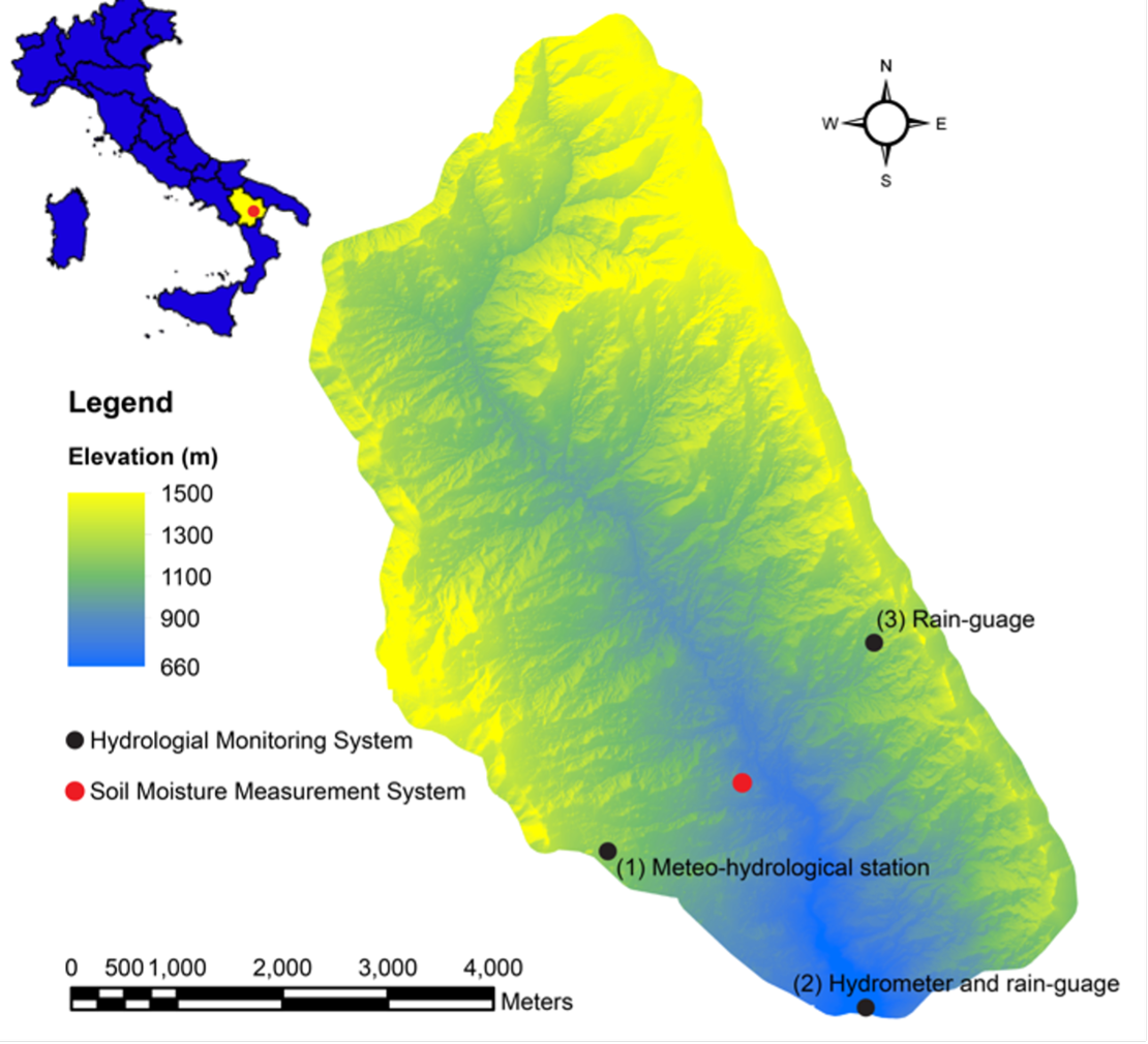 The experimental basin “Fiumarella of Corleto”, located in Basilicata region (southern Italy), is a tributary of the Sauro river (Agri basin) and has an area of 32.5 km2. It is situated in a sub-humid climatic zone with a mean annual rainfall of approximately 720 mm and characterized by hot-humid summers and chilly to mild winters. The interest towards this basin is due to its peculiarities. In fact, the two slopes of the catchment have different land uses: The slope on the left is covered mostly by forests, the slope on the right is covered by agricultural land. In order to characterize with a high level of details the morphology of the two slopes, a DSM of the basin at high-resolution (1 × 1 m) was derived with a LiDAR.