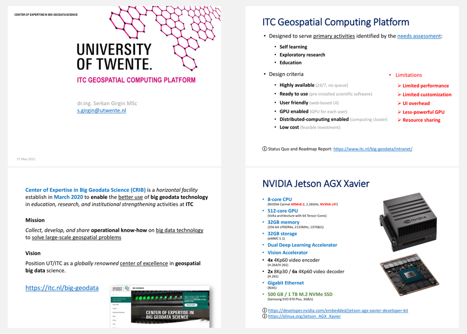 ITC Geospatial Computing Platform has been operational since January 2021 and provides a user-friendly cloud-based interactive interface for data analysis and visualisation with hundreds of ready-to-use scientific and geospatial analysis software packages, including desktop applications (e.g. QGIS, R Studio).