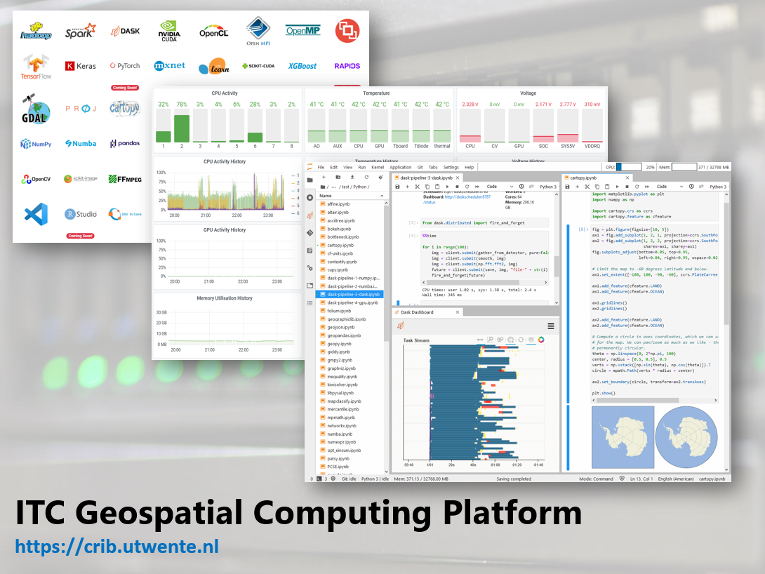 This short online training workshop aims to provide in-depth information on the architecture, capabilities, and limitations of the Geospatial Computing Platform (https://crib.utwente.nl). Available computing resources and core platform components will be explained. Interactive notebook, terminal, and remote desktop interfaces will be demonstrated with different use cases. Best practices for data management and research environment customization (e.g. installing new software packages) will be described. Services integrated to the platform (e.g. PostgreSQL, Geoserver) will be explained and demonstrated.