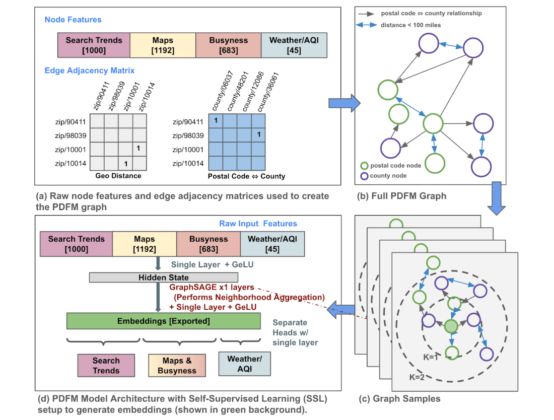 Google Research has unveiled the Population Dynamics Foundation Model (PDFM), a new tool designed to enhance geospatial inference by integrating diverse datasets through advanced machine learning techniques. At the core of PDFM is a graph neural network (GNN) that processes data from various sources, including human behavior indicators (such as maps, business metrics, and aggregated search trends) and environmental factors (like weather and air quality). This data is structured into a graph with nodes representing U.S. counties and postal codes, capturing spatial relationships through proximity-based connections. PDFM has been benchmarked across 27 geospatial tasks, demonstrating superior performance in health, socio-economic, and environmental domains compared to traditional methods and models like SatCLIP and GeoCLIP. Its adaptability to various data resolutions makes it suitable for tasks such as interpolation, extrapolation, super-resolution, and forecasting. This initiative aligns with Google's commitment to advancing AI for societal benefit, complementing other projects like the Open Health Stack and the TimesFM time-series foundation model.