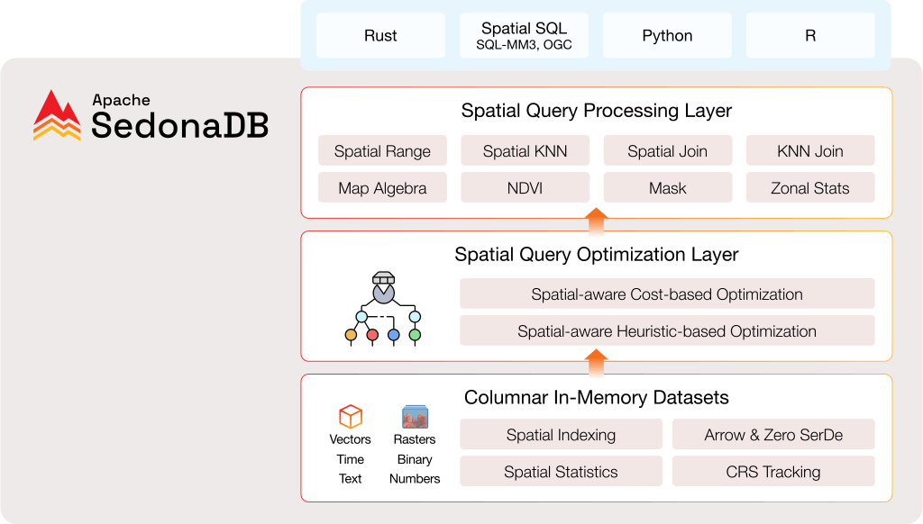 Apache Sedona has introduced SedonaDB, an open-source, single-node analytical database engine that prioritizes geospatial data as a first-class citizen. Developed as a subproject of Apache Sedona, SedonaDB is designed to deliver high-performance spatial analytics for small-to-medium datasets, offering a lightweight alternative to distributed systems like Sedona Spark, Sedona Flink, and Sedona Snowflake. Written in Rust, SedonaDB boasts a columnar in-memory architecture optimized for spatial operations, featuring built-in spatial indexing, coordinate reference system (CRS) tracking, and support for Arrow format with zero serialization overhead. It provides a comprehensive suite of spatial functions, including spatial range queries, K-nearest neighbors (KNN) joins, map algebra, and zonal statistics. The engine supports multiple interfaces, including Python, SQL, R, and Rust, allowing developers to leverage familiar tools for geospatial data analysis. SedonaDB's spatial-aware query optimization and adaptive join strategies ensure efficient processing of complex spatial queries. Benchmark tests have demonstrated SedonaDB's superior performance in geometric computations and complex spatial joins compared to other analytical engines like DuckDB and GeoPandas.