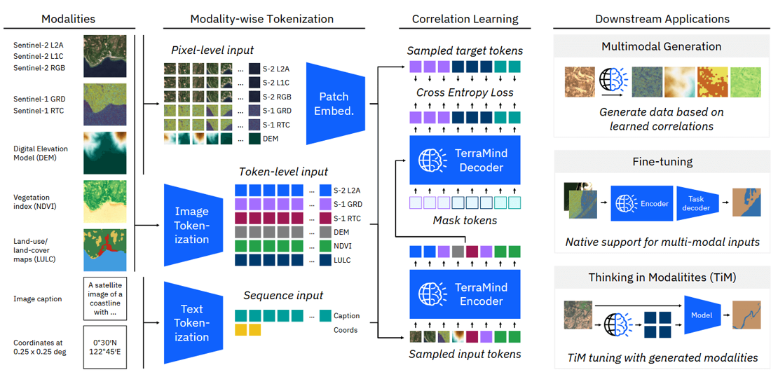 TerraMind is a multimodal foundation model for EO, developed by IBM, ESA, and Forschungszentrum Jülich. It is the first "any-to-any" generative model in the domain, capable of translating between various EO modalities, such as optical imagery, radar data, elevation maps, and textual descriptions. Trained on the TerraMesh dataset, which comprises over 9 million globally distributed, spatiotemporally aligned samples across nine core modalities, TerraMind leverages a dual-scale transformer-based encoder-decoder architecture. This design enables it to process both pixel-level and token-level data simultaneously, capturing fine-grained spatial details and high-level contextual information. A notable feature of TerraMind is its "Thinking-in-Modalities" (TiM) tuning approach, allowing the model to self-generate additional training data from other modalities, thereby enhancing its performance on EO tasks. Empirical evaluations demonstrate that TerraMind outperforms existing geospatial foundation models on benchmark datasets like PANGAEA. The model is lightweight and efficient, requiring significantly less computational resources compared to traditional models, making it suitable for deployment at scale. Researchers and developers can access TerraMind's model weights and fine-tuning toolkit on Hugging Face.