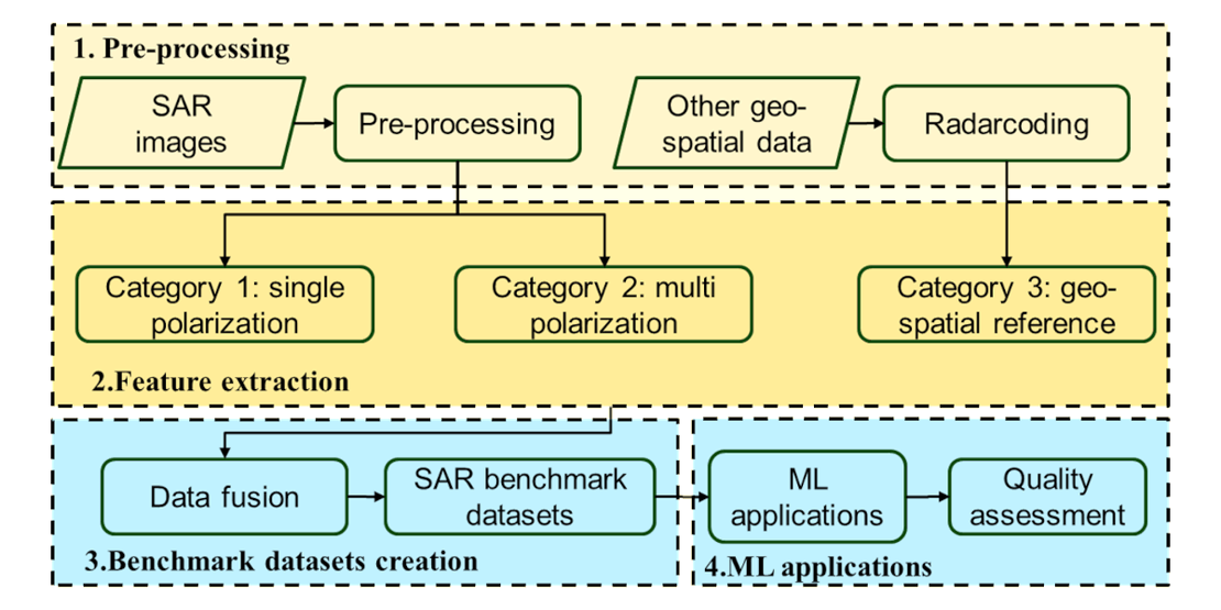 The first component involves the pre-processing of SAR images and the transformation of available geospatial datasets, such as optical imagery, cadastral maps, and geological maps, to generate additional features for SAR data that can serve as reference information. The pre-processed SAR images and radar-coded reference data are extracted according to three categories, and aligned as feature images in the second block. In the third block, the quality of feature images is assessed, and images are fused into standard SAR benchmark datasets. These benchmark datasets are then applied and tested in the fourth block using various machine learning methods. All SAR features are concatenated as separate layers in the NetCDF data format, which incorporates Spatio-Temporal Asset Catalogs (STAC) to support efficient data querying.