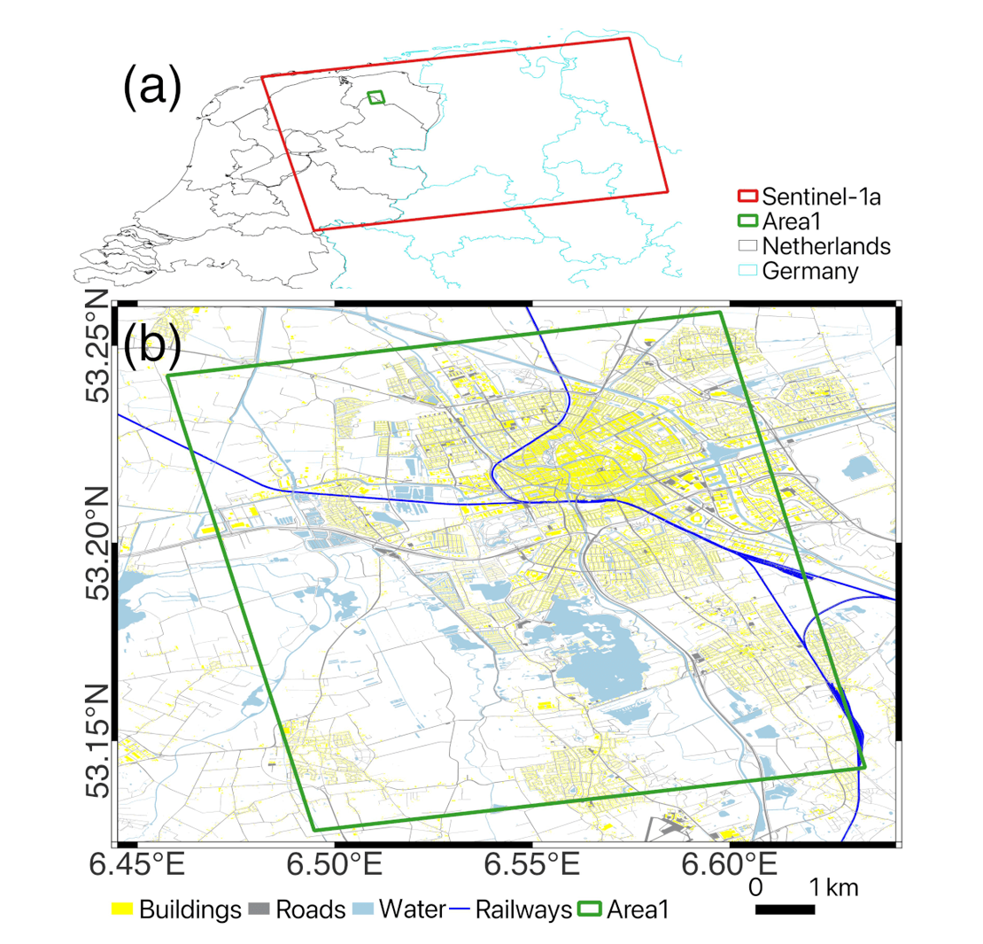 Figure 2. The study area in Groningen, The Netherlands. (a) shows the coverage of the Sentinel-1 image, with the AOI, in green, partly covering the city of Groningen, (b) is the zoomed-in of the green AOI in (a), describing Groningen city with the LULC classes of buildings, roads, water, and railways.