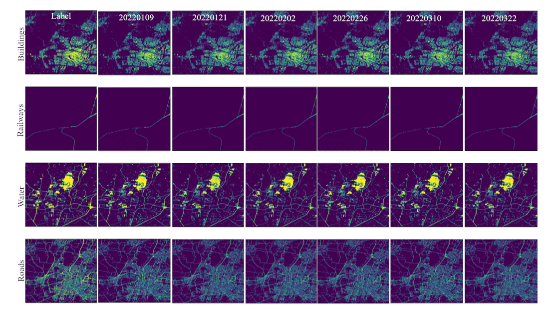 Figure 4. Four landcover types in rows including buildings, railways, water, and roads. The first column is label while the rest are predicted results of corresponding dates.