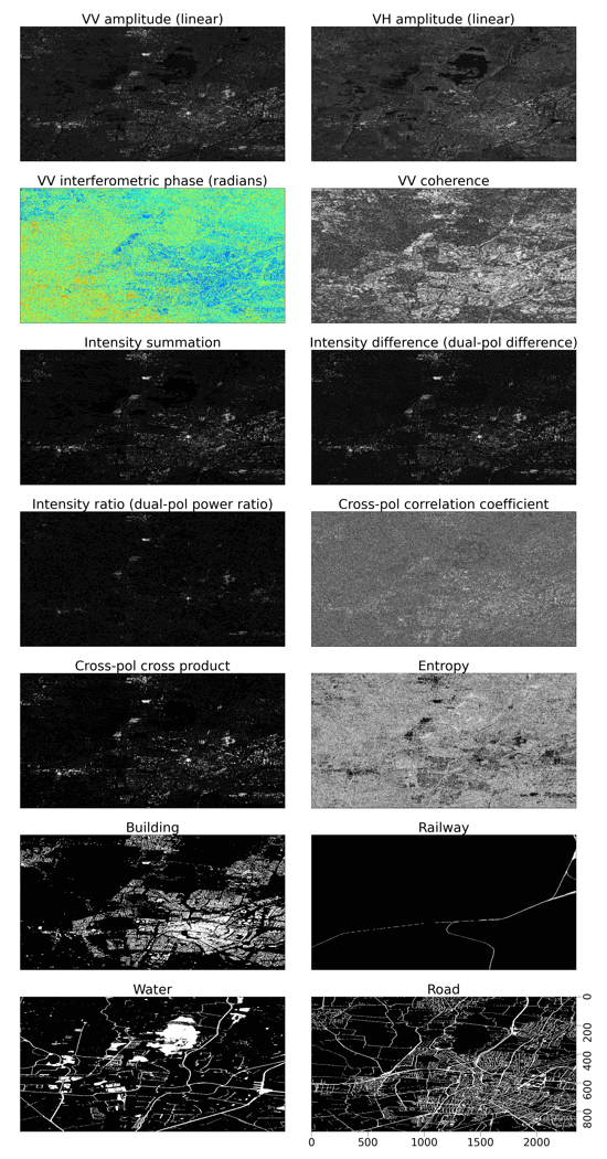 The extracted features included VV amplitude, VH amplitude, VV interferometric phase, VV coherence, intensity summation, intensity difference, intensity ratio, cross-polarization correlation coefficient, cross-polarization cross product, and entropy. Additionally, features representing buildings, roads, water bodies, and railways were extracted. The first ten features were generated according to Categories 1 and 2, while the latter four were produced following Category 3 specifications (Figure 3).
