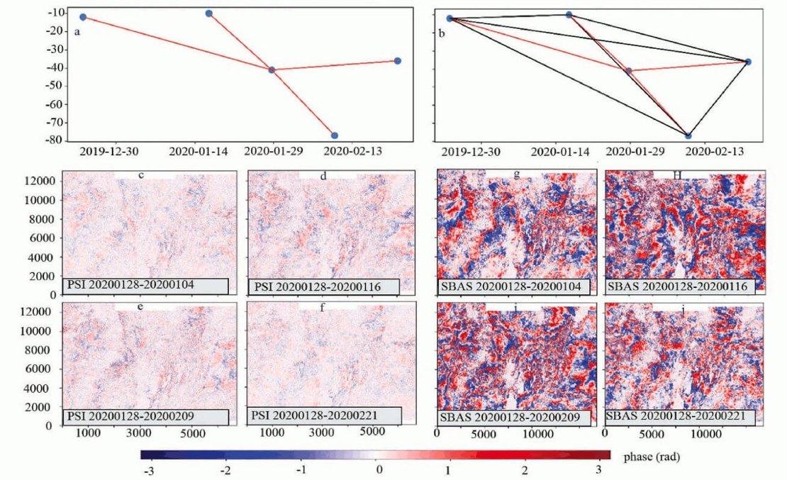 Figure 2. Examples of interferograms were generated using the PSI and SBAS graphs. (a) Shows the PSI network graph, and (b) shows the SBAS network graphs. (c, d, e, and f) show the PSI interferograms and (g, h, i, and j) show the SBAS interferograms.
