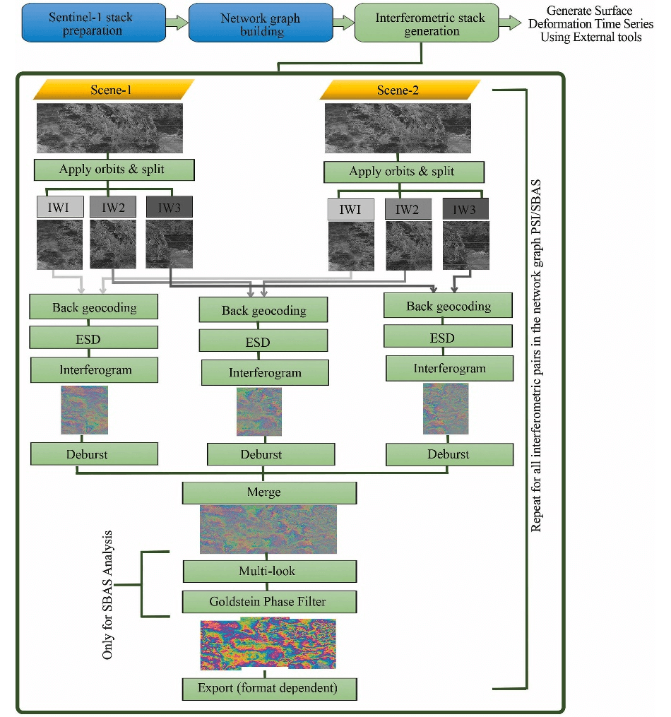 The proposed workflow SNAPWF is written in Python and depends on the available open-source tools ASF-Search and SNAP-ESA, which are integrated into Python-based codes to perform the processing chain from dealing with the raw Sentinel-1 data until generating the time series interferometric stacks. The workflow introduces the flexibility of generating both PSI and SBAS interferometric stacks in which the network graphs can be easily built and modified, making it possible to generate time series interferometric stacks with different configurations. The workflow consists of four stages: 1) Sentinel-1 stack preparation and data download using ASF-Search, 2) network graph building for PSI and/or SBAS using Python, 3) Interferometric stack generation using SNAP-ESA, and 4) interferometric stack export to the desired formats for further surface deformation estimations.