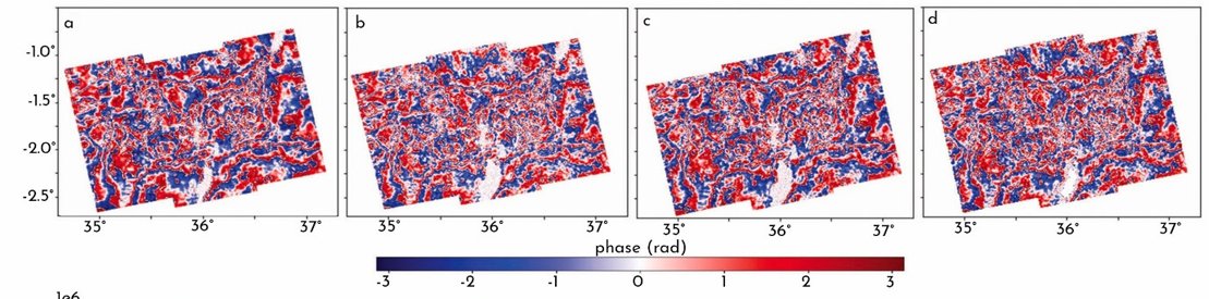 Figure 3. The comparison between interferograms from a) SNAPWF, b) Alaska service, c) LiCSBAS, and d) GMTSAR for the study area.