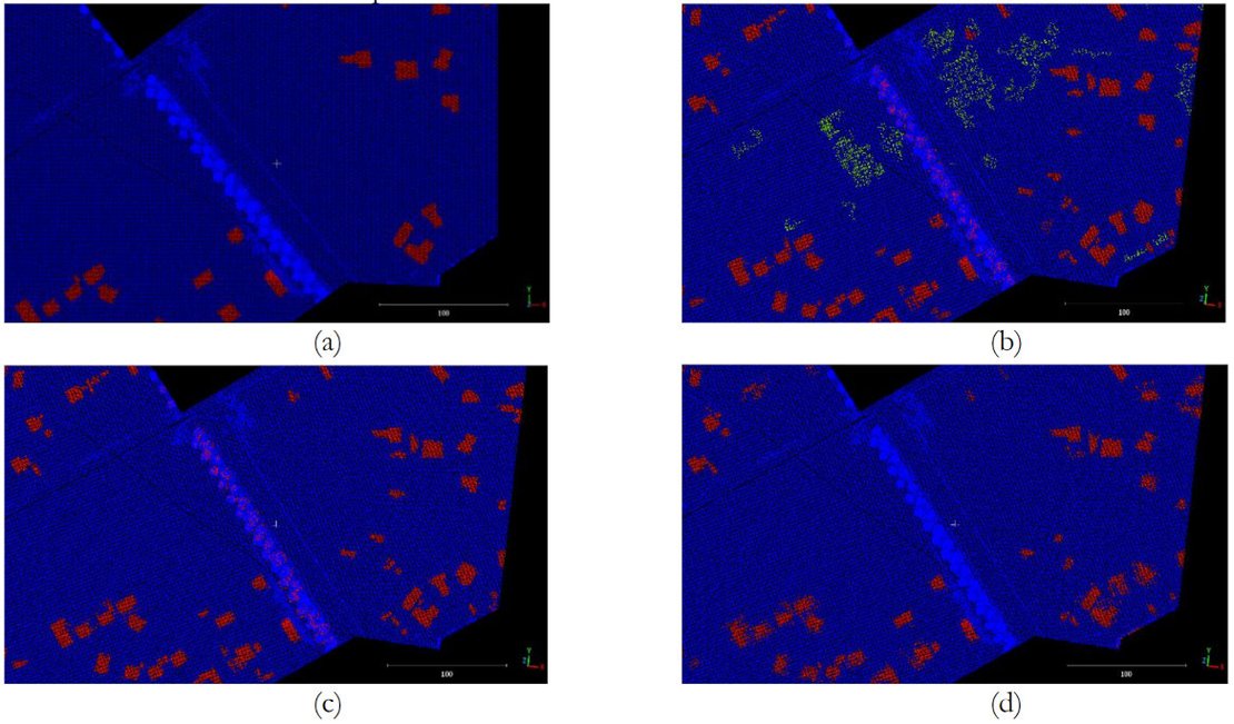 Figure 2. Prediction on an AHN tile, a) Ground truth, b) RF, c) FCNN, and d) CNN. Blue colour represents non-change, yellow/ light green represents new buildings and red represents demolition.