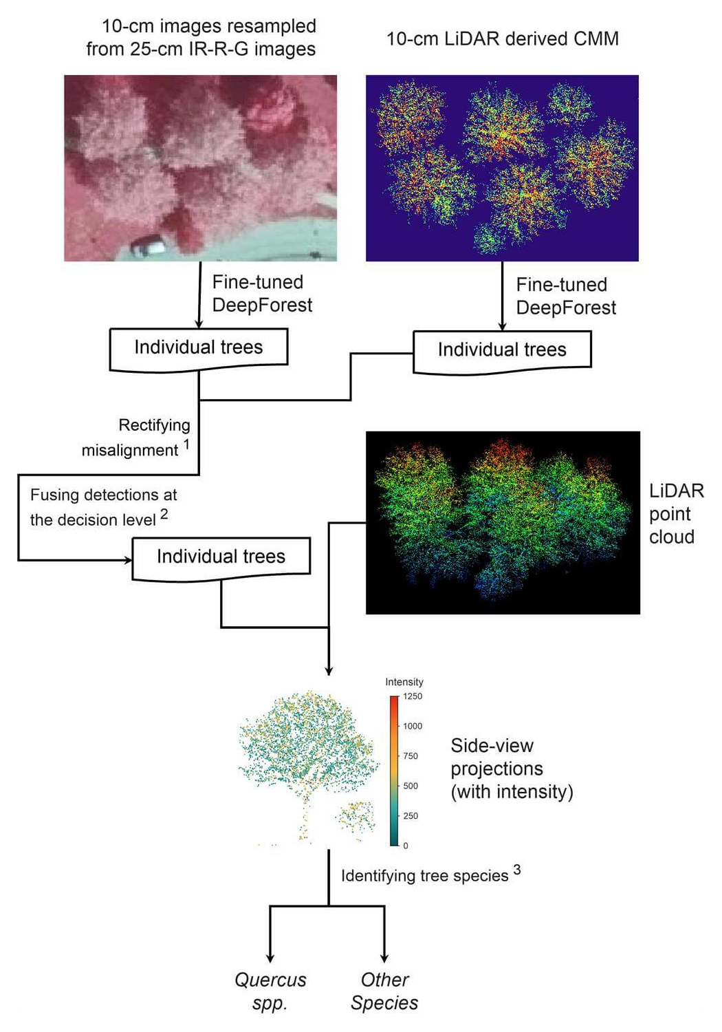 We employed a multi-source data fusion approach, combining airborne LiDAR point clouds and high-resolution aerial photographs to map urban oak trees in Dutch cities. A deep learning pipeline was developed using convolutional neural networks (CNNs) to detect tree crowns and classify oak species based on structural and spectral features. The methodology involved pre-processing LiDAR data to generate canopy height models, extracting candidate tree objects, and aligning these with spectral data from aerial imagery (Figure 2). Model training was conducted using manually annotated samples across diverse urban settings.