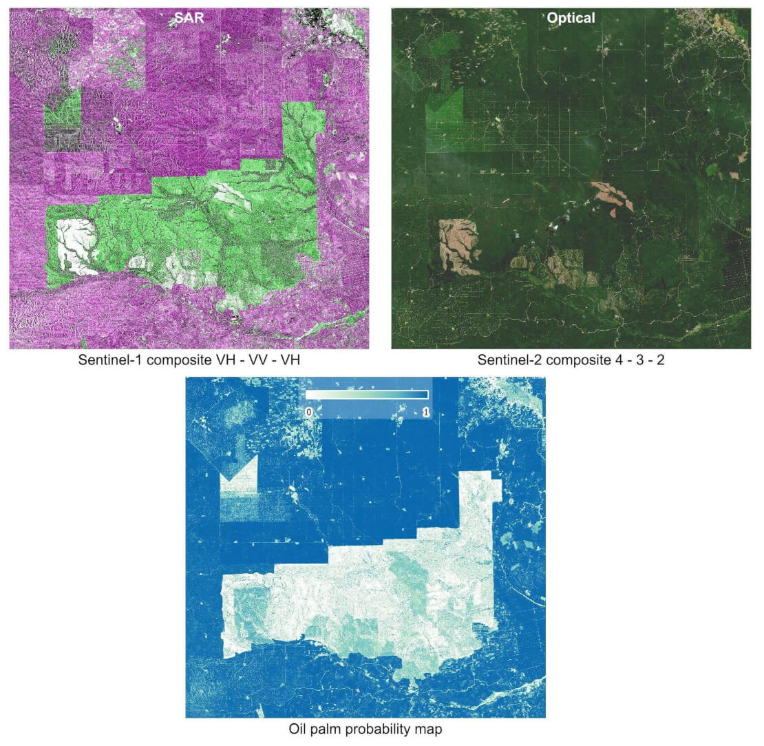 An existing publicly available oil palm dataset served as ground truth labels for training a neural network classifier using SAR data, with performance compared against an identical model trained on Sentinel-2 optical imagery. Results demonstrated that the SAR-trained model achieved superior performance in oil palm detection and species differentiation from surrounding non-palm vegetation, though immature plantations with sparse canopy coverage were occasionally missed (Figure 2). This optimized model was subsequently applied to identify oil palms within 100-meter riparian buffer zones using multi-temporal Sentinel-1 datasets, revealing significant temporal expansion patterns of oil palm cultivation (Figure 3).