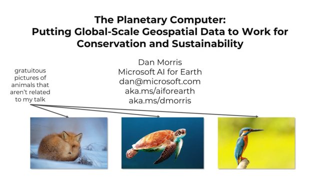 Environmental sustainability depends on very large geospatial data sets, particularly satellite imagery and climate forecasts. But working with geospatial data – whether it’s large or not – is a deep skill set unto itself, and working with very large data – whether it’s geospatial or not – is its own field of expertise as well. Consequently, the niche expertise required in GIS and distributed computing creates a huge barrier between this invaluable data and the sustainability practitioners who need it. Microsoft’s Planetary Computer aims to lower that barrier, by combining (1) a 25PB catalog of analysis-ready geospatial data, in consistent file formats, in a single data center, (2) an API that facilitates spatiotemporal querying over that data, and (3) a computing environment that simplifies distributed computing workloads. Of course, files and distributed computing don’t address environmental issues directly, so Microsoft is also partnering closely with the sustainability community to build applications that put the Planetary Computer to work for sustainability decision-making.