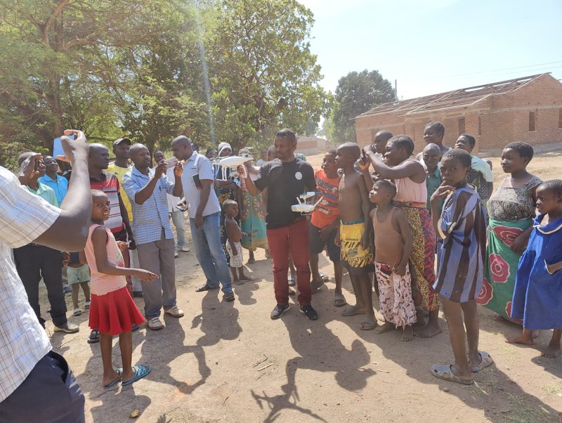 Kyungu, Karonga, Northern Malawi. Demonstration of a drone flight and aerial image collection of the community, amidst curious onlookers, 29th November 2022.
