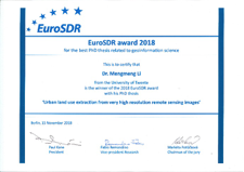 EuroSDR (formerly OEEPE, established in 1953) is a pan-European organization linking national mapping and cadastral agencies with research institutes and universities for the purpose of applied research, and securing timely, research-based knowledge in Europe. Since 2016, EuroSDR has recognised contemporary PhD theses that have significantly contributed to the development of geoinformation science in the context of national mapping and cadastral agencies (http://www.eurosdr.net/news/2018-eurosdr-award-best-phd-thesis-related-geoinformation-science). The EuroSDR PhD award consists of a certificate, a sum of 500 EUR and the invitation to present the work during the EuroSDR Board of Delegates meeting.