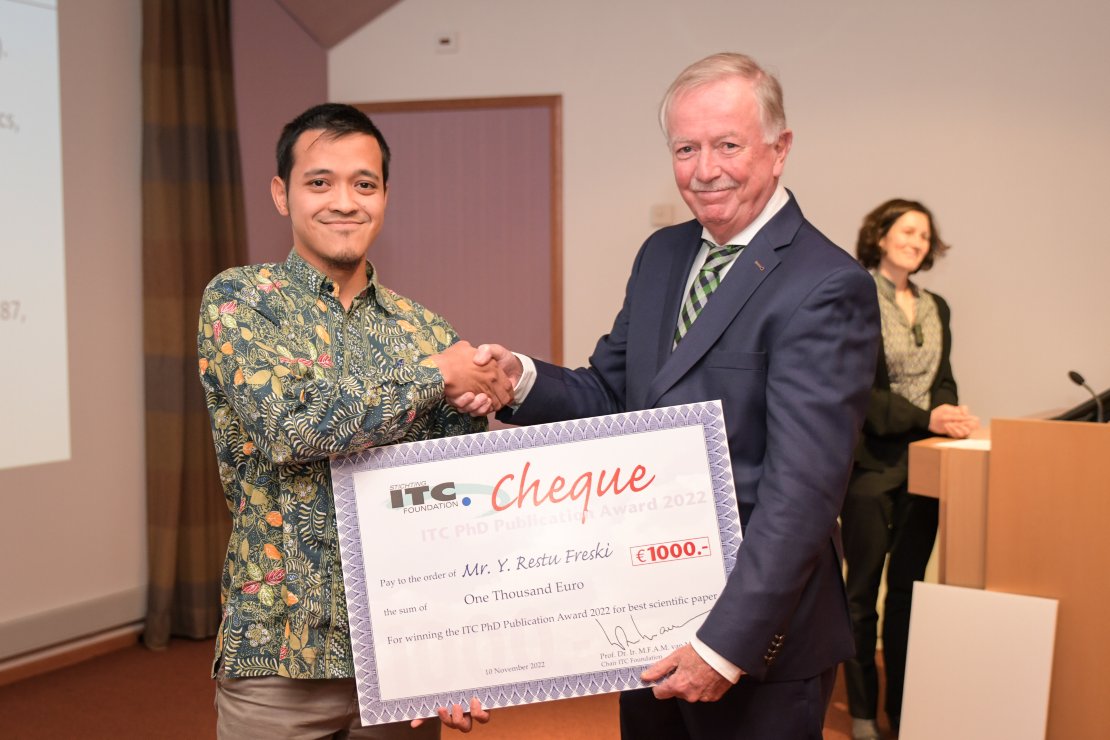 At 16:00 on Thursday 10 November 2022, people started to take their seats at the ITC auditorium. Staff members and PhD candidates awaited the presentation of the ITC PhD Publication Award 2022 winner. But for the first time, due to the high level of the presented research, the committee selected two winners: Yan Restu Freski and Wufan Zhao.