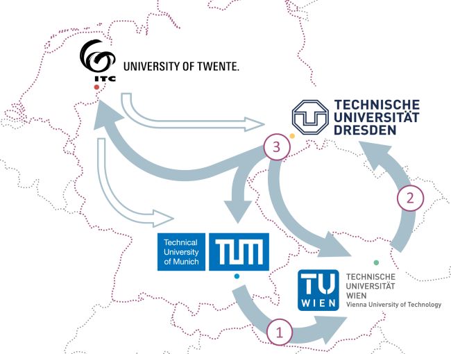 The partner universities will be able to award a total of 48 scholarships to talented students from all over the world in the coming years. The universities are jointly responsible for the programme as a whole, but each has separate responsibility for the quality and implementation of one of the four semesters that make up the two-year programme. Students of the programme spend time at four different universities. The UT’s Faculty of Geo-Information Science and Earth Observation is responsible for coordinating and implementing the fourth and final semester, during which students carry out Master’s research and write their final Master's thesis. The faculty also offers various online lectures throughout the two-year programme.