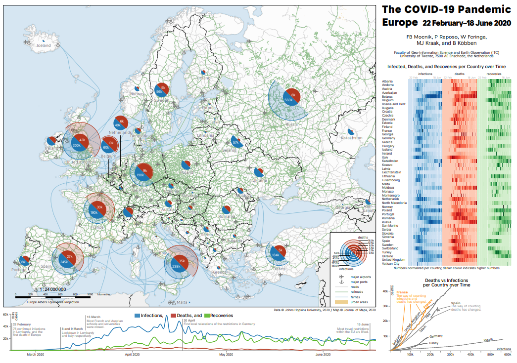 The maps are part of a publication titled “Epidemics and pandemics in maps – the case of COVID-19”, which has been published in the Journal of Maps and can be read online. The maps are open access and free to use. The researchers, Franz-Benjamin Mocnik, Paulo Raposo, Wim Feringa, Barend Köbben and Menno-Jan Kraak are all part of the Department of Geo-Information Processing (GIP; faculty of ITC).
