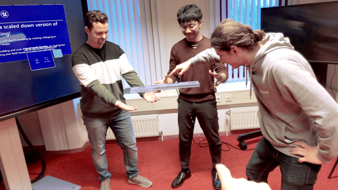 Visiting the future ITC building “Langezijds” was only possible by asking for a guided tour. With a security helmet and a designated time frame, visitors could wander around the building in construction to see it with their own eyes. Now, three students in the Geo-Information Science course of the HTHT minor, Alen Badrajan, Georgi Nikolov and Wicak Wicaksono, have integrated the digital model of the new building in Augmented Reality technology, using a HoloLens from ITC's VISUSE Lab. With their incredible work, it is now possible to visit the building digitally and comfortably and to play with different scales that allow us to view the site from unlimited perspectives.