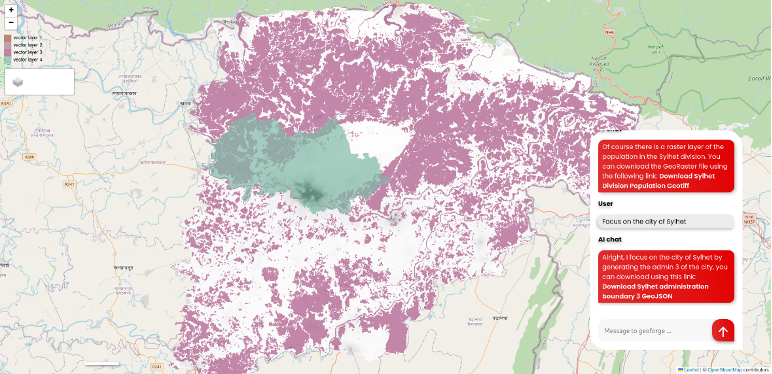 GeoForge was used for analysing a flood event in Bangladesh. In less than 30 seconds and by using a text prompt, the platform was able to display near real-time satellite imagery, and extract the flood extent. This was cross-referenced with geodata about critical infrastructure like power lines, water pipes, hospitals, roads, and rail systems as well as building and population datasets. This analysis helps determine the impact of the flood, such as estimating the number of people without power, assessing the accessibility of hospitals given the road conditions, evaluating property damage, and identifying whether the affected area was known to be at risk. This information is crucial for effective response and planning, including preventive measures for future incidents.