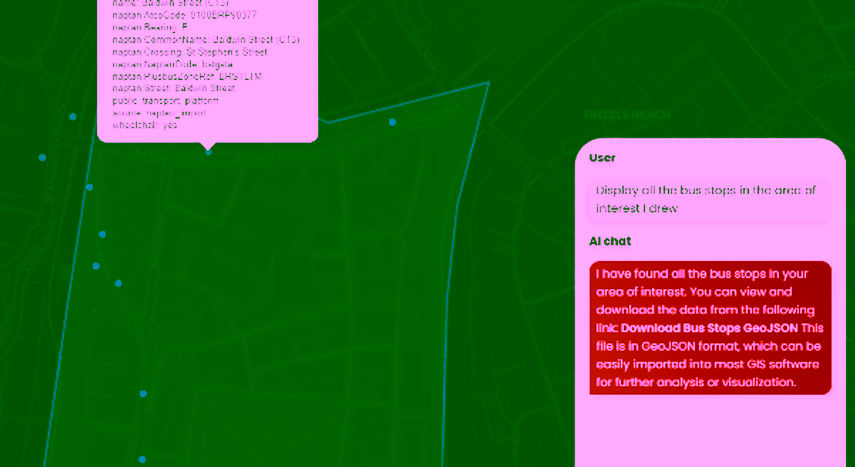 Analysing geospatial data is unfortunately quite a complex task for non-specialists, especially during emergencies such as a flood.  To support accessibility for everyone, Ageospatial uses natural language and human interaction to make geospatial analyses.