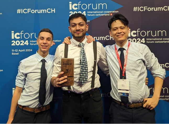 Current Ageospatial team winning the 3rd prize of the Swiss International Cooperation Award 2024, Néo Coquidé (left), Kevin Torrin (right) and Maaz Seikh (middle).