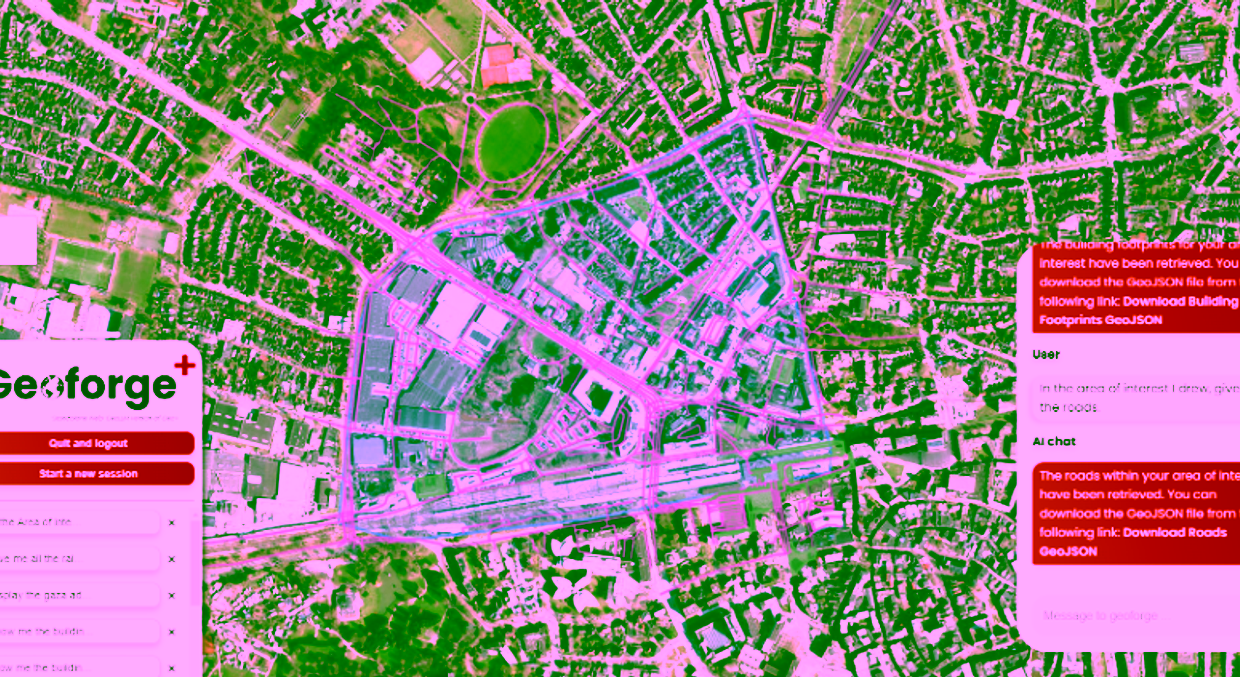 GeoForge can provide geospatial information from simple text requests, here for example to extract building footprints.