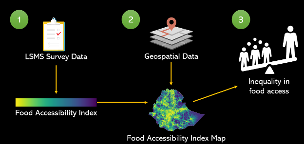 Food access can be broken down into three dimensions: physical, social, and economic access. However, social access, which relates to preferences for socially acceptable food, was hard to measure comprehensively due to a lack of data. We focused on physical and economic access, which had available data, such as ownership of assets (economic access) and the location of enumeration areas relative to roads and markets (physical access).