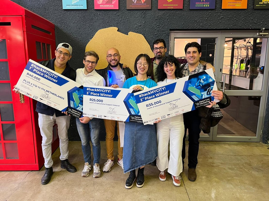 Five students from the faculties of ET and ITC achieved outstanding results at the Digital Twin Technology Hackathon that was held in Johannesburg last month. They won three prizes for designing a digital twin prototype for waste collection (1st prize), road asset management (2nd) and social safety (3rd). The jury highly appreciated their designs and envisions the potential for future development of the generated ideas.