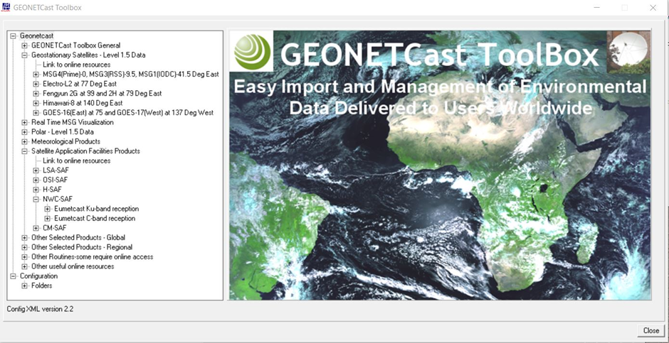 The GEONETCast Toolbox is a plug‐in developed under ILWIS386 to support education and research in geo‐sciences. The toolbox plugin allows the processing of the data delivered through GEONETCast‐EUMETCast data streams, relevant for land, ocean and atmosphere.