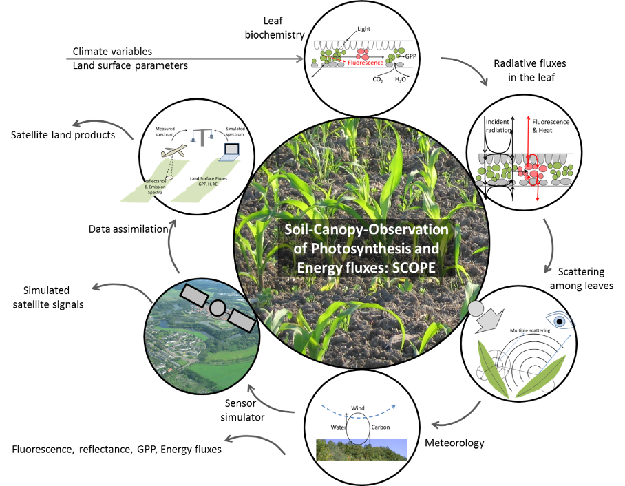 SCOPE is a simulation model for quantitative remote sensing of vegetation and land surface processes. It describes radiative and non-radiative energy fluxes in the soil-vegetation-atmosphere system.