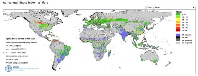 FAO has developed ASIS to support its global food security monitoring work by detecting agricultural areas with a high likelihood of water stress (dry-spells and drought), as part of their Global Information and Early Warning System on Food and Agriculture (GIEWS). The Agriculture Stress Index is based on Earth Observation data on vegetation and land surface temperature combined with information on agricultural cropping cycles and a global crop mask. The resulting index maps highlight areas of anomalous vegetation growth and potential drought in crop zones during the growing season.