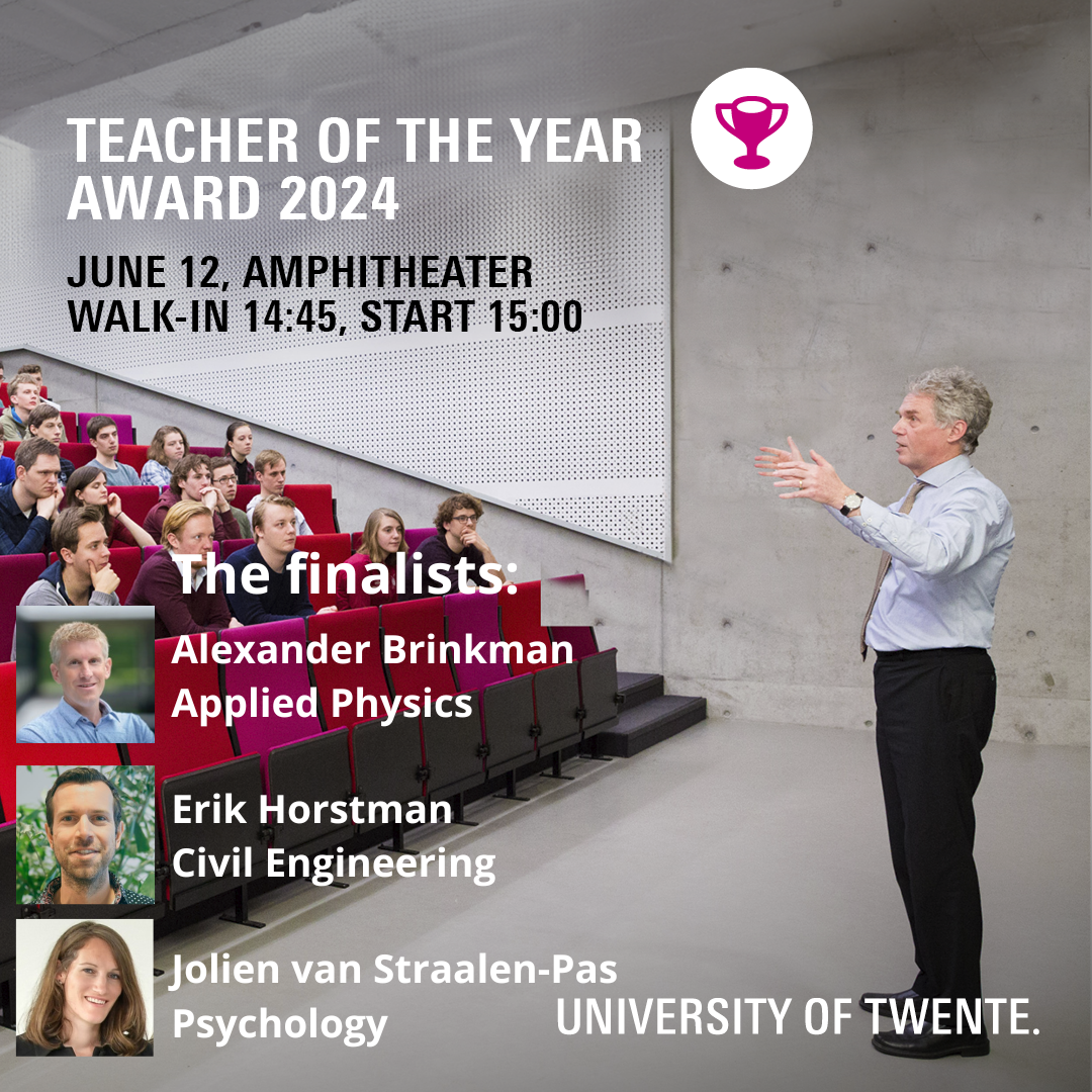 One of the highlights of the week of education, is the election of the UT Teacher of the Year. The purpose of this election is to highlight inspiring and good teaching in higher education. On Wednesday June 12th the finalists will give an inspiring and enthusiastic lecture on the Agora stage in the Vrijhof. Rector magnificus Tom Veldkamp will present the award to the winner. The winner will participate in the national teacher of the year event. Students, faculty colleagues and other supporters are welcome to attend. Come join us and support your favorite teacher! Walk-in is at 14:45, and the event starts at 15:00. After the ceremony an informal drink will be held.