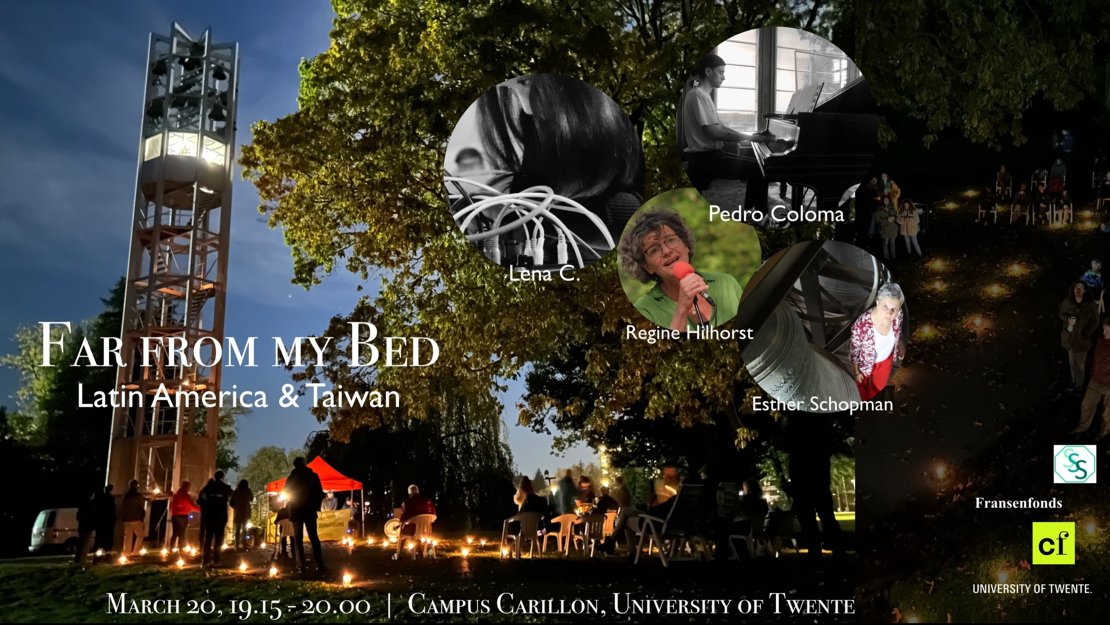 The first episode of Far from My Bed took place June 23 at the City Carillon in the Grote Kerk at the Oude Markt of Enschede. Here the complex conflict in the Palestinian territories and its profound effects on the people involved and the world community was transferred to music and sound. The second part in this series is scheduled for March 20, 2025, 7:15 - 8:00 pm. This time we highlight femicide in Latin America and the impending annexation of Taiwan by China. For this, Esther Schopman collaborates with Taiwanese sound artist Lena C., Latin American composer Pedro Coloma and Enschede poet Regine Hilhorst.