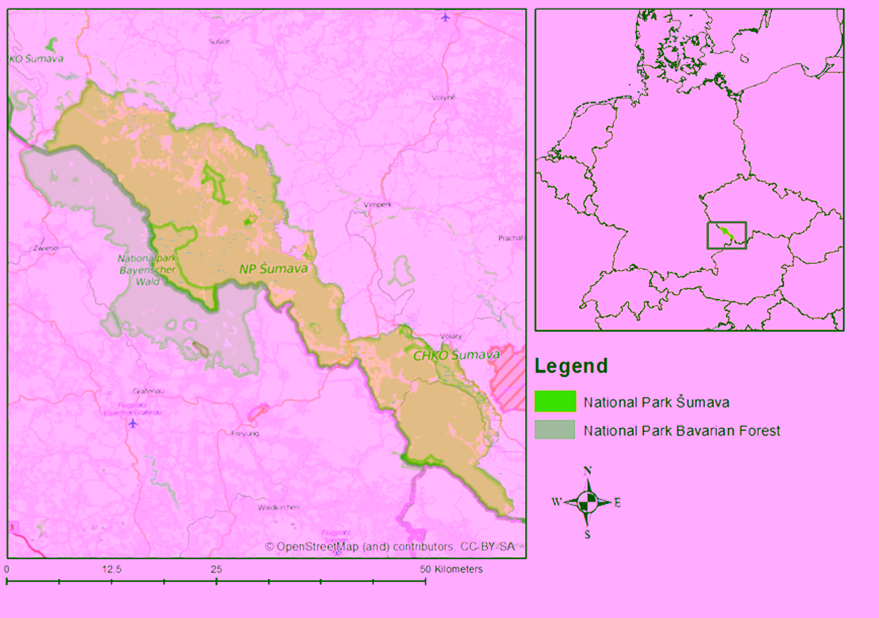 The National Park complex comprises mixed mountain forests, wetlands, and alpine tundra areas under conservation management. There are large disturbances by bark beetles and windstorms in recent decades, and the forest structure in the park is developing into a very heterogeneous old-growth forest.