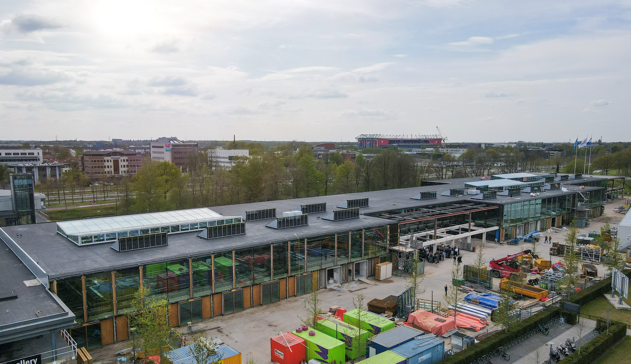 On 21 April 2022, a milestone was reached in the transformation of Langezijds. The new home of the Faculty of Geo-Information Science and Earth Observation (ITC) is now completely weatherproof. This special moment was marked by the installation of the final pane of glass in the new curtain wall. The construction consortium Dura Vermeer Bouw Hengelo/Trebbe en Croonwolter&dros will now start work on the final phase.