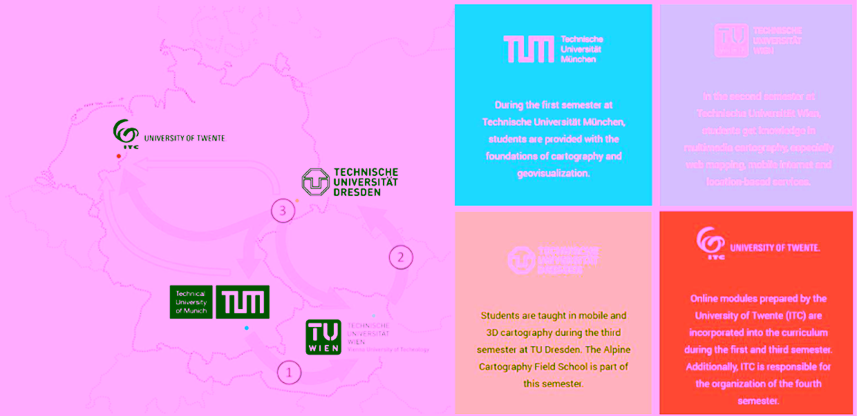 Students spend their first semester at the Technical University of Munich, their second semester at the Technical University of Vienna, and their third semester at the Technical University of Dresden. During these three semesters, online modules of the University of Twente – ITC Faculty are part of the curriculum. The fourth semester marks the time when students prepare for their Master’s thesis at one of the four participating universities.