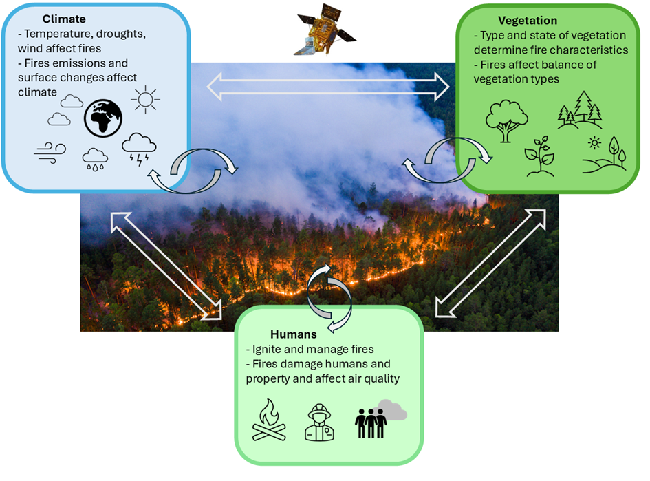 Figure: Schematic of main interactions between climate, vegetation, humans and fire addressed within INFLAMES. Fire image by Greenpeace.