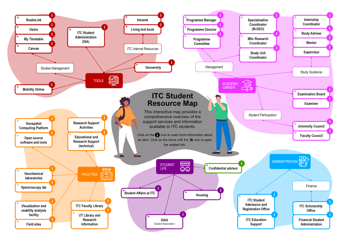 Next week, our new students start their journey at our Geo-information Science and Earth Observation faculty. New students can, understandably, sometimes find it challenging to navigate the wealth of information available on our university’s intranet. To make this easier, our Education Support team developed an interactive information map that provides quick and clear access to essential resources.