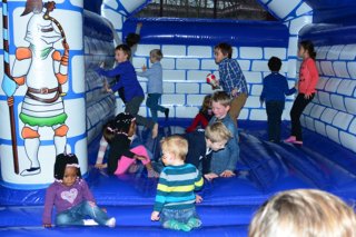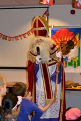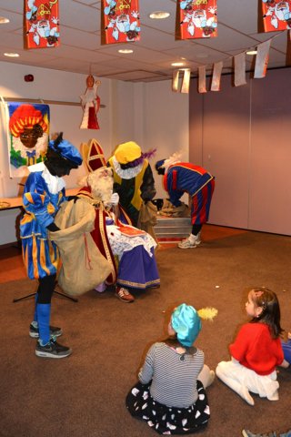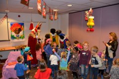 Om half drie sprongen de eerste kinderen al vrolijk rond op en in het springkussen. Voor de wat minder actieve kinderen lagen er kleurplaten en kon er geschminkt worden. Vaardige handen maakten er hele mooie plaatjes van. De welkomstpiet was al flink bezig met het strooien van pepernoten toen hij plotseling schreeuwde dat Sinterklaas in aantocht was. Potloden vielen op tafel, schmink werd gestopt en ineens was het springkussen bijna leeg; alle kinderen renden naar de hal om Sint welkom te heten.
