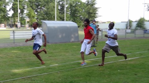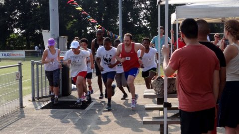 Also in the shade, the 40 m sprint lane was taken by young and old runners. After a hesitant start the coach had to kick the final runners who wanted to attempt their first run (or 9th) from the track to prepare for the final. The children had apparently most energy, some running more frequently than the registration form could handle. It is also nice to see that annually these kids return because they have fun and would like to see how much they improve. And in some cases if they can defeat their parents. Tobias Bakx did do so claiming actually the fastest qualifying time ever (5.12s). Wayhudi ran 5.16s in 2007. His dad and organiser finished in 5.38s. But both were running out of competition in their own family battle. Ajay (the physiotherapist on duty) qualified for the finale in 5.34s followed very closely by Maurice Mugabowindekwe (5.43s) and Stephen Kibet (5.49s). It promised to be a thrilling final. But at the start Maurice had a splendid reaction and accelerated away from both Ajay and Stephen finishing 2nd and 3rd. The female competition had fewer dare devils. Thea Turkington (6.03s and much faster than the year before) and Fangyuan (6.93s) qualified as usual together with mom Jeanna Hyde (7.18). Unfortunately Fangyuan could not participate in the final because of a Quadriceps problem giving Thea the opportunity to defend her title with success.