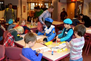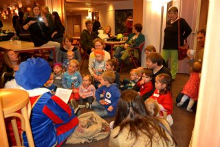 Inmiddels hadden de pieten al gezien dat de kist met cadeautjes was aangekomen. Véél eerder dan vorig jaar, gelukkig. Voordat die kist opengemaakt zou worden wilde Sint wel dat de kinderen nog even een klusje zouden doen. De grotere kinderen moesten helpen met het maken van mooie slingers van papier en de kleinsten konden aanschuiven bij voorleespiet.