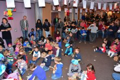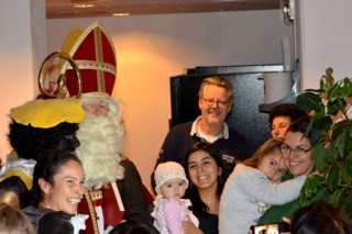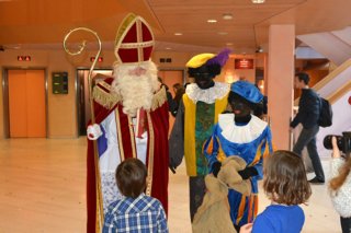 De tocht door het restaurant van het ITC duurde wel even want iedereen wilde Sint een handje geven of op de foto. Ook de volwassenen! Eenmaal in de annex kon Sint op zijn speciale stoel gaan zitten en de kinderen toespreken. Na wat ouderlijke opmerkingen over je kamer opruimen, iets wat de kinderen natuurlijk bijna allemaal deden, had hij een belangrijke vraag aan de kinderen; of ze nog speelgoed thuis hadden wat ze niet meer gebruikten? En of ze dat dan door hun papa of mama naar het ITC konden brengen voor de kinderen van de vluchtelingen, want voor die kinderen had Sinterklaas zelf geen cadeautjes bij! Ze moesten donderdag of vrijdag de cadeaus naar het ITC laten brengen en dan zou Sint er voor zorgen dat ze bij de vluchtelingen terecht zouden komen.