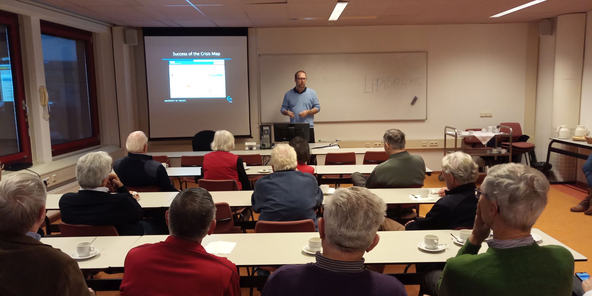 Jeroen gaf een heldere uitleg over de achtergrond van het vergaren van geografische informatie d,m.v. Crowdsourcing, in het bijzonder van Open Street Map ten behoeve van het maken van zo gedetailleerd mogelijke geografische bestanden. Bijvoorbeeld voor het Rode Kruis om b.v. toegangswegen te vinden om zo snel en efficiënt mogelijk een route te bepalen voor een moeilijk te bereiken locatie om noodzakelijke hulp te kunnen bieden.
