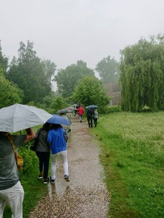 “Opened to the public in 1987, Museum Insel Hombroich comprises a 21-hectare, conservation-grade landscape and is an exclusively daylight museum with ten walk-in sculptures some of which are used as exhibition buildings. To make art and nature a sensory experience, not only has artificial lighting been dispensed with but also all labelling, signposts, captions under works of art, barriers and so on, and for that matter, didactic material of any kind. “ -- from: https://www.inselhombroich.de/en/On the Friday, 20 participants got into the bus for the trip to the Insel, just south of Düsseldorf. In sharp contrast to the past weeks of great summer weather, we arrived in pooring rain, and started our guided tour huddled under umbrellas and running from pavilion to pavilion….