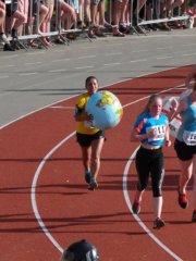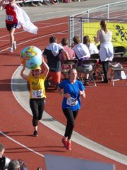 From 11.30 AM the two noon teams started the final stages to bring the relay vest to Enschede. At one point the two teams/runners were actually running together, something which did not happen before and was caused by the fact that the most experienced team and alumni navigator made a terrible navigation mistake causing the alumni team to reach a relay point minutes after arrival of the previous runner. Maybe that is the reason that he was hiding under the yellow cap. The coincidence is however exemplary for the minimal difference in total time between the two teams. Mariana and Anke returned the vests to the Old Market in Enschede. Where two female runners and 2 male runners would take care of the final stages. And what final runners. The Run4Fun student team was represented by Dean Tom Veldkamp. But first Ruosha and Adriana, who especially travelled from TU Delft to Enschede to represent the ITC alumni team, started their 7.4K final stage run. Under really nioce weather circumstances all ITC runners reached the campus and were welcomed by a large and very enthusiastic crowd. For this special occasion, they were asked to carry inflatable globes on their final meters proudly representing the multi-cultural international population.