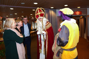 Om 3 uur werd Sinterklaas door de Dean Tom Veldkamp, in gezelschap van de Managing Director Erna Leurink en de Vicevoorzitter van het College van Bestuur Mirjam Bult, officieel welkom geheten. Sinterklaas was echter slechts met één van de 3 Pieten!? Waar waren de andere 2 (vorig jaar wilden ze ook al de snor drukken door ‘thuis te gaan werken’!!....Ja, ja…). Op dat moment kreeg WelkomsPiet net een telefoontje van de ‘missing’ Pieten. Door de live verbinding konden wij op het grote scherm de zoektocht van de Pieten naar het ITC meemaken….. op het Universiteitsterrein!!?? Wat bleek: de Pieten hadden gehoord van de ‘verhuizing’ van het ITC naar de nieuwe locatie op de campus, dus daar waren ze op dat moment op zoek naar het nieuwe onderkomen van het ITC!! Inmiddels ware de Pieten onderweg en kwamen gelukkig al snel binnen en werden al zingend door de kinderen onthaald.