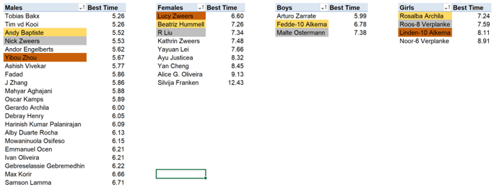 Running was apparently very attractive, perhaps due to its shady position; 83 attempts were recorded for a record 37 participants. For sure this called for several finals to determine the 40m champions. Under loud applause of supporters the girls fought for the championship until the finish line. After video analysis Rosalba was declared champion, followed by Roos and Linden. Almost as close was the finish inn the boys final, won by Fedde just before Malte. Fastest qualifier Arturo decided to concentrate for the 1 Mile long distance run. On the basis of qualification times, it was undisputed which female was entitled to be the champion since Lucy was the only qualifier with a sub 7 seconds time (6.60). But at the start in the final, she tripped, fell and saw Beatriz and Ruoyun Liu fighting for the glory. This battle was concluded with a win for Beatriz. While the soccer competition was still going on, Yibou could not participate in the men’s final. Andy and Nick lined up and sprinted away after the “Go”. Five and a half seconds later Andy crossed the finish line first.After the qualification matches in the Volleyball competition the referees had to do some math since three teams ended up with 2 wins. Even without calculator, smartphone, Karl and Dick quickly calculated some ratios to find out that “Loose a set, win a match” and “Smashing Dynamite” had to play the final to determine 1st and 2nd place. During qualifications the “Smashing dynamites” clearly won the battle from “Loose an set win a match”. In the final this was completely turned around and “Loose a set win a match“ won with a clear margin, 26-19, to claim the title in the volleyball competition.