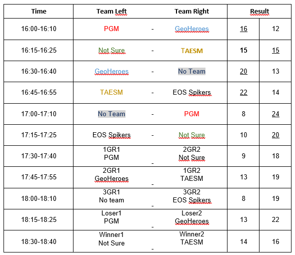 The 6 volleyball teams played in two groups to qualify for the second round. Good old referee Karl was frequently replaced by volunteers, to give Karl a well-deserved break. PGM and TAESM won their groups and played the second round against the 2nd ranked to try to qualify for the final. That turned out to be too difficult for PGM. In the final TAESM defeated team Not Sure to claim the victory in the volleyball competition 2023. According to notes on the day GeoHeroes ranked 3rd having defeated PGM (where PGM actually had defeated GeoHeroes in the group stage).