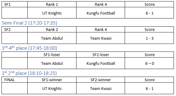 In absence of official referees, the teams playing soccer were asked to provide a referee when not playing. This worked out quite nice and really nice ‘battles were fought’. The sports day organizer had shared a completely wrong playing schedule, but with the help of the captains, players and referees, a correct playing schedule was finished. The 5 teams would all play each other once. The top 4 would play semi finals followed by a final and 3rd/4th place match. The UT Knights were overall winner after winning all their matches.